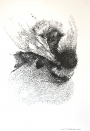 De tecknade humlorna blev till under Pandemin. Bilderna är dystra, färgade av pandemi men också av ständiga rapporter om klimatförändringar. Humlorna får symbolisera och ge uttryck för vår känslighet och sårbarhet. Nedan screentryck med "Myller av humlor".