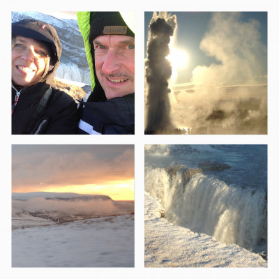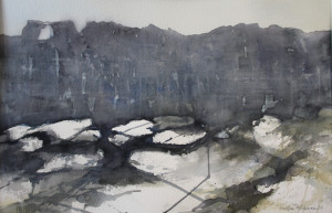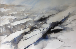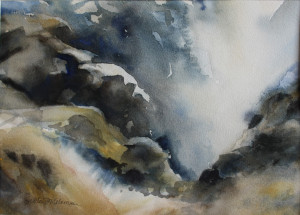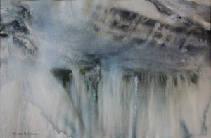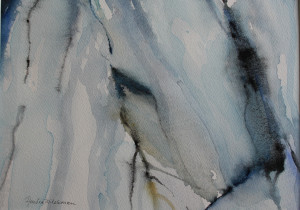 Naturen kom mycket nära under en resa i november månad 2017 till Island i samband med en samlingsutställning i Nordens hus, Reykjavik. Kontinentalplattor som möts, hettan under fötterna, vattenångan som stiger ur marken, bitande kyla och vatten som smälter. Landskapet med all förstenad lavasten bildade ett månlandskap under snön. Efter resan dit, där isen och glaciärerna smälter allt fortare, målade jag akvarellerna ”Isvatten” och ”Smältvatten”.